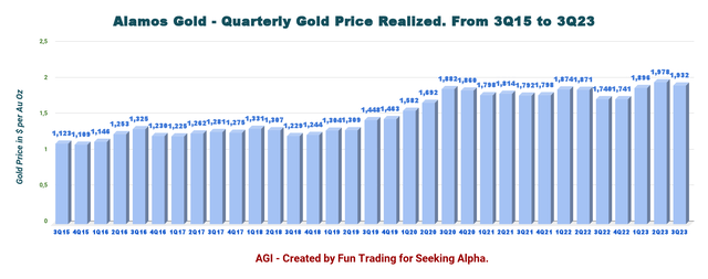 The price of gold realized for the third quarter was $1,932 per ounce, down 2.3% sequentially.