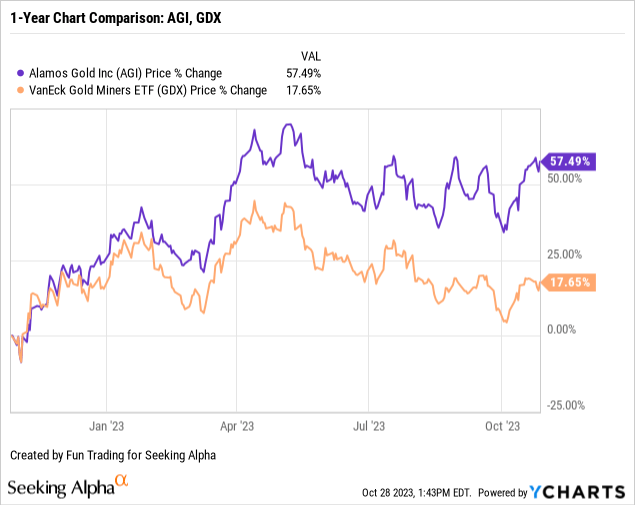 AGI is currently up 54% year over year and outperforming the VanEck Vectors Gold Miners ETF (GDX).