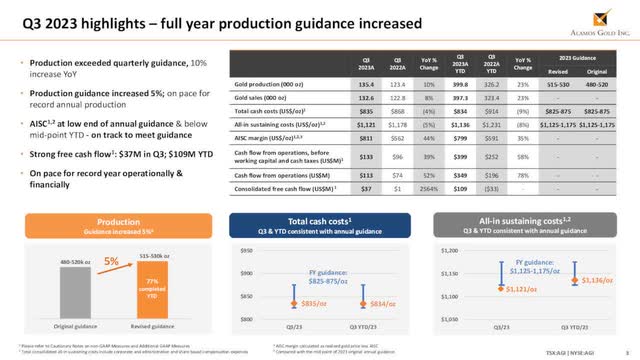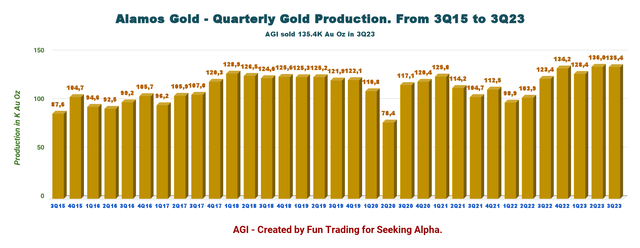 In 3Q23, Alamos Gold sold 132,633 Au ounces of gold, with a reported production of 135,400 Au ounces.