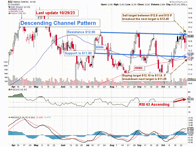 The AGI chart shows an ascending channel pattern with resistance at $12.90 and support at $11.90. With the RSI at 62, it is getting close to the overbought level and flashing a sell signal soon.