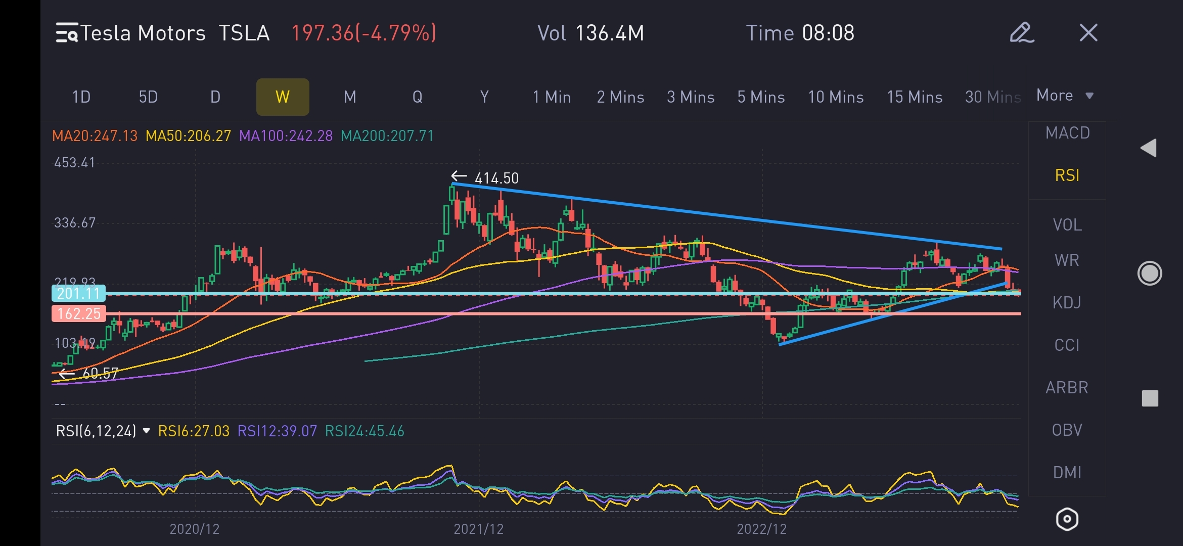 Like I mentioned earlier, I think the pink line will hold in the short term. Tesla should probably test 187 and bounce back towards 201. However, from the middle term point of view, I won't bet on Tesla to hold these ranges.