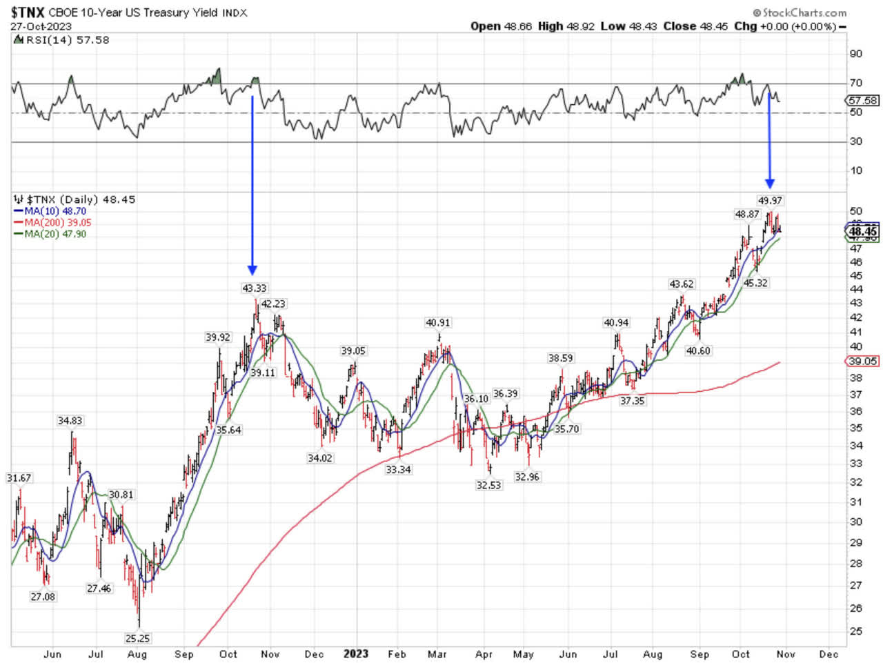 • By themselves, Treasury yields spiking out of control can cause a recession, and October delivered both a 5% yield on 10-year Treasury bonds and 8% fixed-rate mortgages.