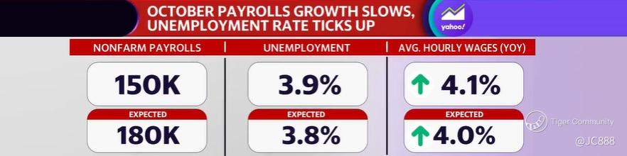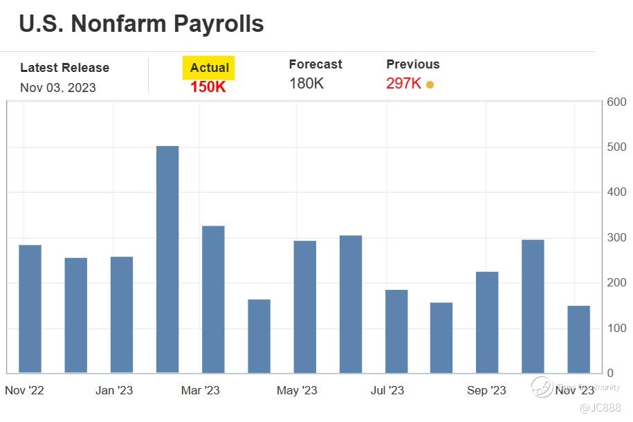 For October 2023, US economy added 150,000 jobs versus expected 180,000 jobs as surveyed by Bloomberg.