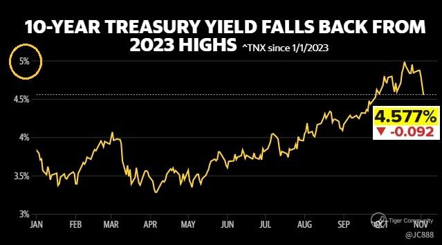 For the first time in weeks, 10 years US Treasury yield dipped below the 4.60% (see above).