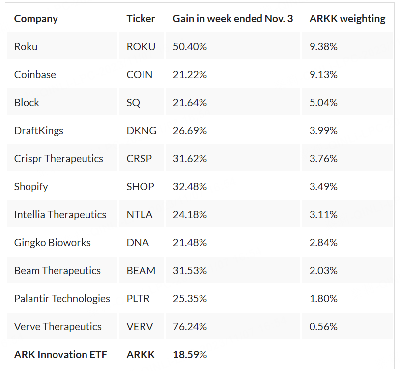Credit massive moves among key components. $Verve Therapeutics(VERV)$ (VERV), exploded for a 76% weekly gain on an expanded $Eli Lilly(LLY)$ (LLY) partnership. VERV stock is a relatively small ARKK hold. Roku stock, now the No. 1 holding in ARKK, vaulted 50.4% last week, thanks to robust Roku (ROKU) earnings results.