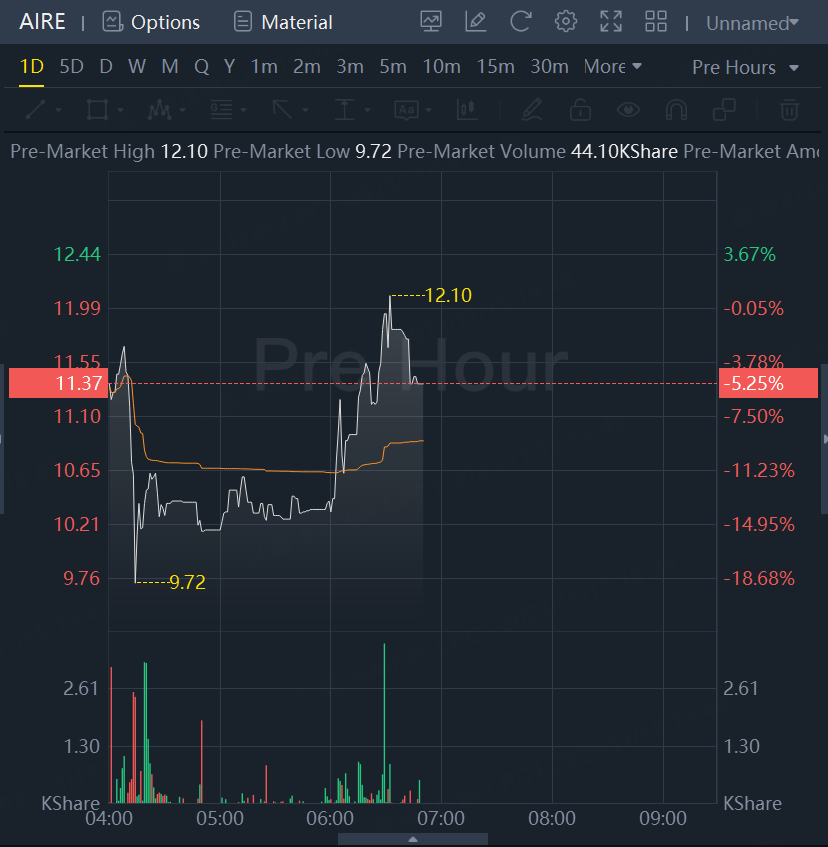 Shares of AIRE are soaring on extremely high trading volume Tuesday. According to data from Benzinga Pro, more than 7.8 million shares have already been traded in the session, far exceeding the stock's average volume of just over 444 thousand shares.