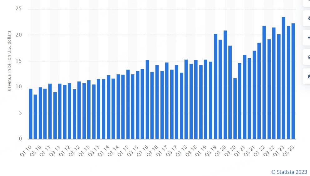 In the third quarter of 2023, The Walt Disney Company generated about 22.33 billion U.S. dollars in revenue. Company's revenues for the quarter grew by 3.7 percent year-on-year.