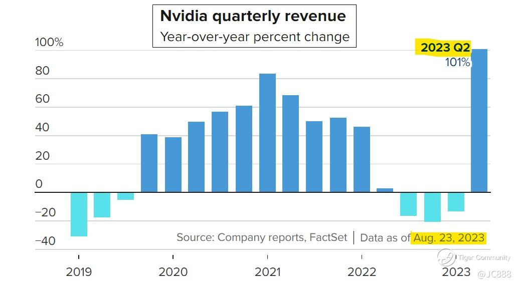 On 23 Aug 2023, Nvidia said it expects fiscal third-quarter revenue of about $16 Billion, higher than $12.61 billion forecast by Refinitiv.