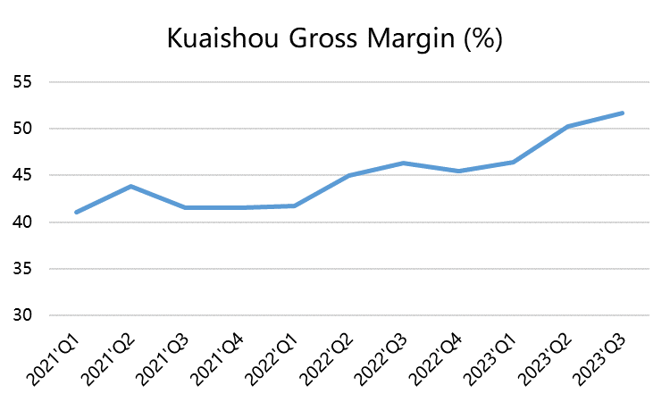Live-streaming media continues to grow steadily, as expected. Despite the industry facing issues of canceled ad placements, Q3's live-streaming business still achieved 8.6% growth, about 2 percentage points higher than market expectations. This indicates that KOL cooperation during the summer remained smooth and stable. Additionally, Kuaishou's advertising monetization level is relatively low, so it will continue to focus on cooperation with MCN agencies and top KOLs. However, ongoing regulatory measures in live-streaming will continue to bring pressure, which will further promote the transformation of monetization for broadcasters, MCN agencies, and platforms.
