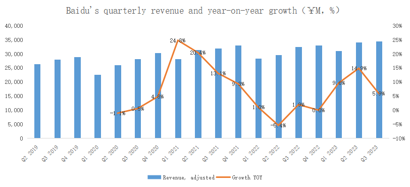 First of all, Baidu's revenue in the third quarter was 34.447 billion yuan, slightly exceeding analyst expectations of 34.2 billion yuan, but the year-on-year growth rate was only 5.9%. Considering the domestic pandemic was raging in the third quarter of last year, Baidu's revenue was at a low point, and now the pandemic prevention policy is completely canceled, the growth rate is less than 6%, which shows that Baidu is not having a good time: