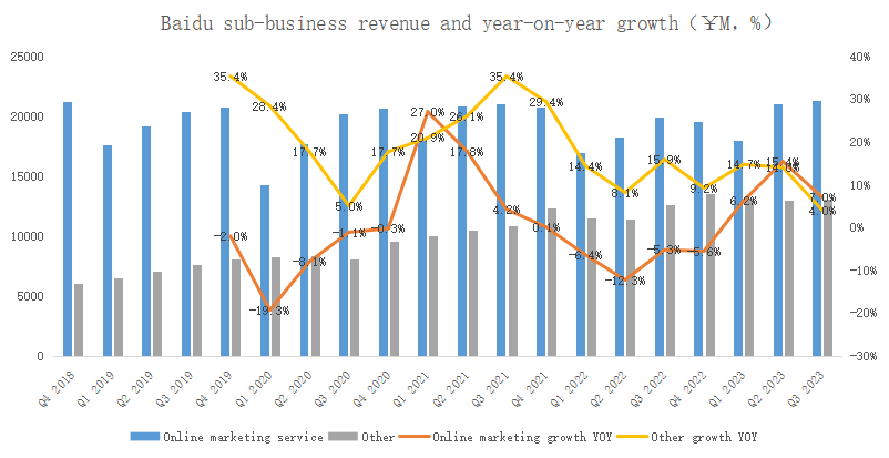 By business, Baidu's online marketing service revenue was 21.346 billion yuan, slightly exceeding analyst expectations of 21.16 billion yuan, but the year-on-year growth rate is only 7%, and the year-on-year growth rate of the third quarter of last year was -5.3%, so the 7% year-on-year growth is not surprising.