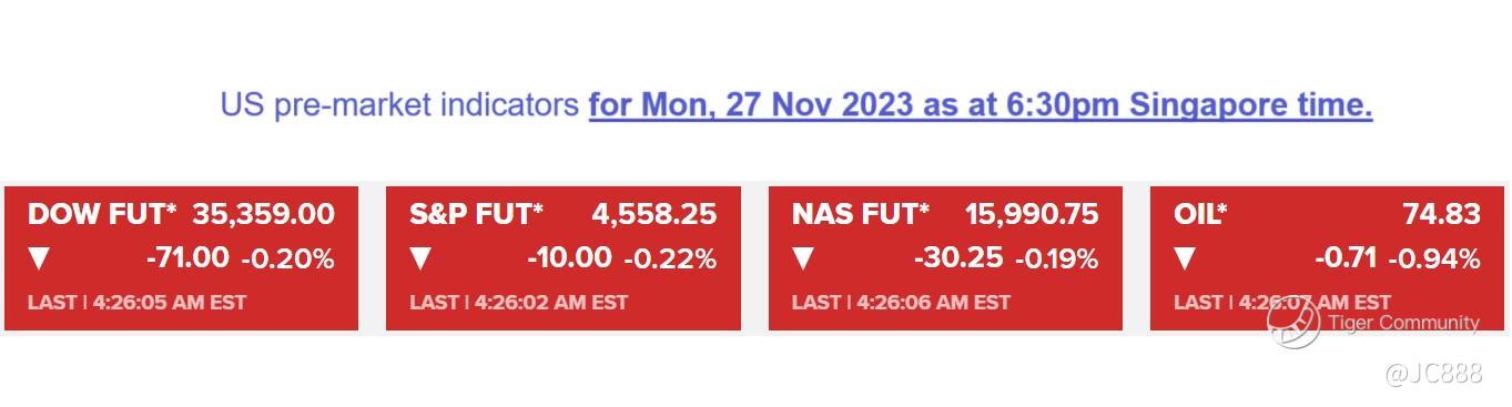 Personally, I think US stocks are poised for a slightly lower open on Mon, 27 Nov 2023: