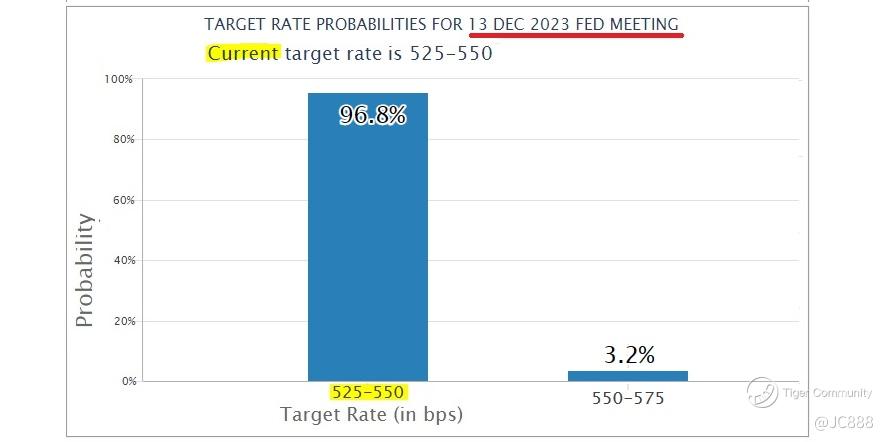 Based on the latest CME Fed Watch tool, the probability for the Fed to keep interest rate status quo in December 2023 stands at 96.8%.