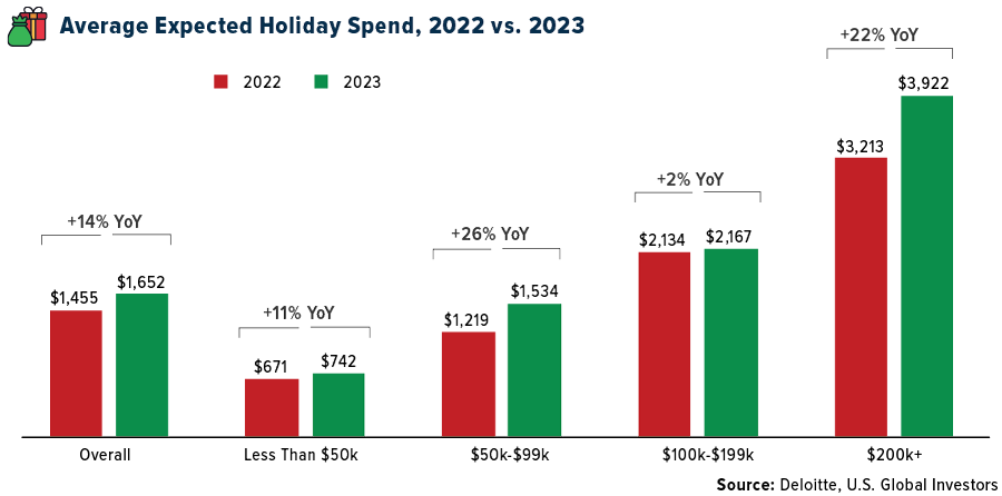 First, let’s examine the outlook for holiday spending. According to Deloitte’s Holiday Retail Survey, consumers are poised to spend an average of $1,652 this holiday season, a 14% increase compared to last year. Those making $200,000 or more plan to spend almost $4,000, up from an average of around $3,200 last year. These figures eclipse pre-pandemic spending levels, suggesting a return to normalcy.