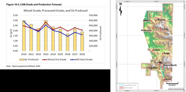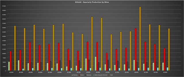 B2Gold Quarterly Production by Mine - Company Filings, Author's Chart