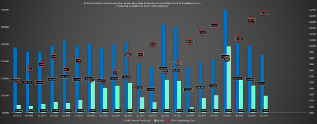 B2Gold - Quarterly Production & AISC (Operating Mines) + Fekola Production - Company Filings, Author's Chart