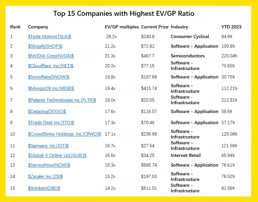 He pointed out the top 15 growth stocks with the highest EV/GP multiples (Enterprise Value/Gross Profit Ratio) where the market sees a premium valuation.