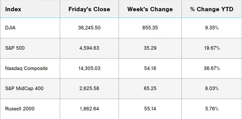 Most of the major indexes ended higher for the week, with the S&P 500 Index and Nasdaq Composite rounding out on Thursday their best monthly gains (8.9% and 10.7%, respectively) since July 2020. Falling Treasury yields seemed to continue to boost sentiment, and a broad index of the bond market recorded its best monthly gain since 1985.