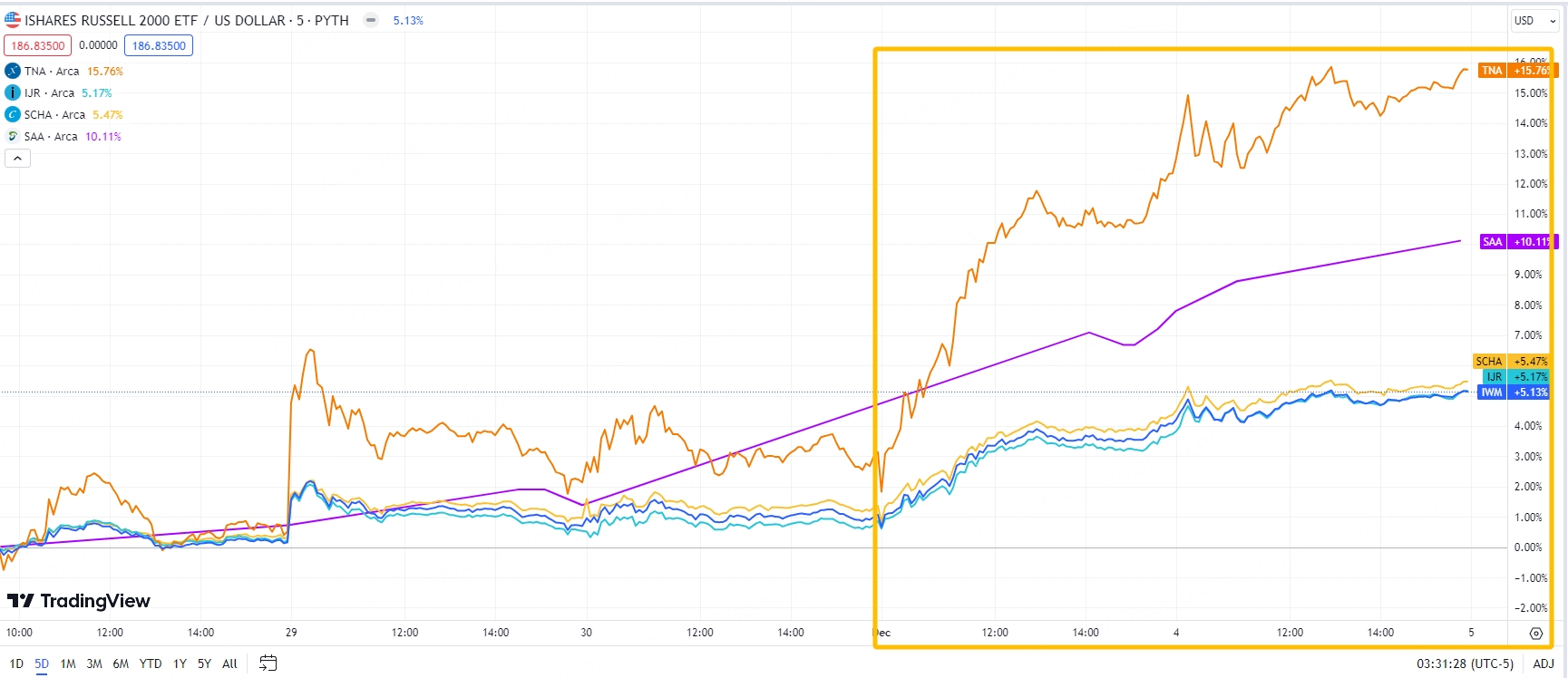 However, ETFs such as $iShares Russell 2000 ETF(IWM)$ , $Direxion Daily Small Cap Bull 3x Shares(TNA)$ , $iShares S&P SmallCap 600 ETF(IJR)$ , $Schwab US Small-Cap ETF(SCHA)$ , and $ProShares Ultra SmallCap600(SAA)$ , which represent small-cap stocks, show two big positive candle lines.