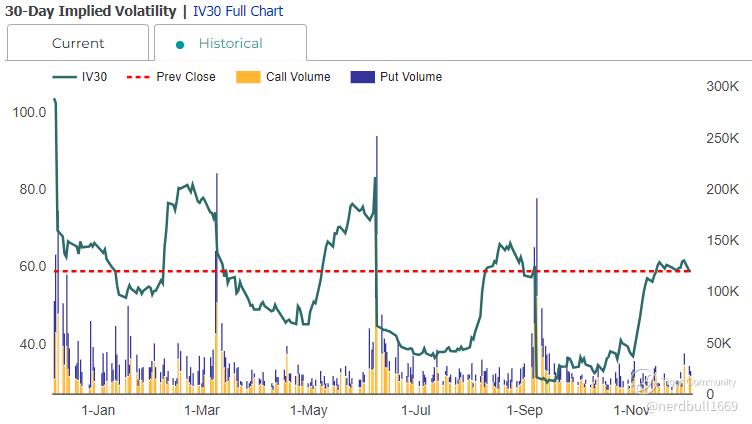 Historically, the median IV for the current month of December was 57.5 compared to the current IV of 56.9. The IV level in January following December tended to be lower, with a median IV of 50.5