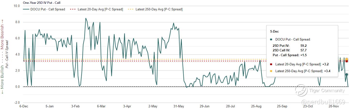 The current IV (56.9) in DOCU is 59.6% above its 20 day HV (35.6) suggesting that options markets are predicting future volatility to trade above the most recent 20 day realized volatility.