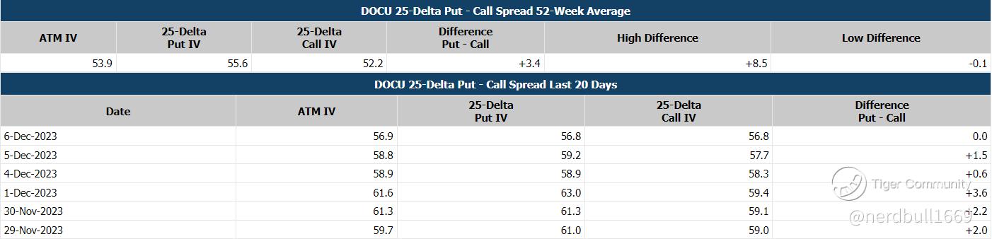 DOCU's last earnings implied volatility (IV30) going into earnings was 60.2. The last time DOCU released earnings, the implied volatility dropped to 31.5, resulting in an implied volatility crush of 48%. 5 days after earnings, the 30 day IV was 30.8.