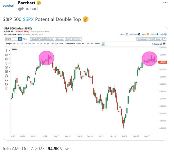 Chicago@Barchart posted a chart and triggered discussion among netizens on X Platform: $S&P 500(.SPX)$ potential double top.