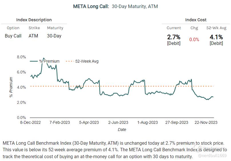 META Long Call Benchmark Index (30-Day Maturity, ATM) is unchanged today at 2.7% premium to stock price. This value is below its 52-week average premium of 4.1%.