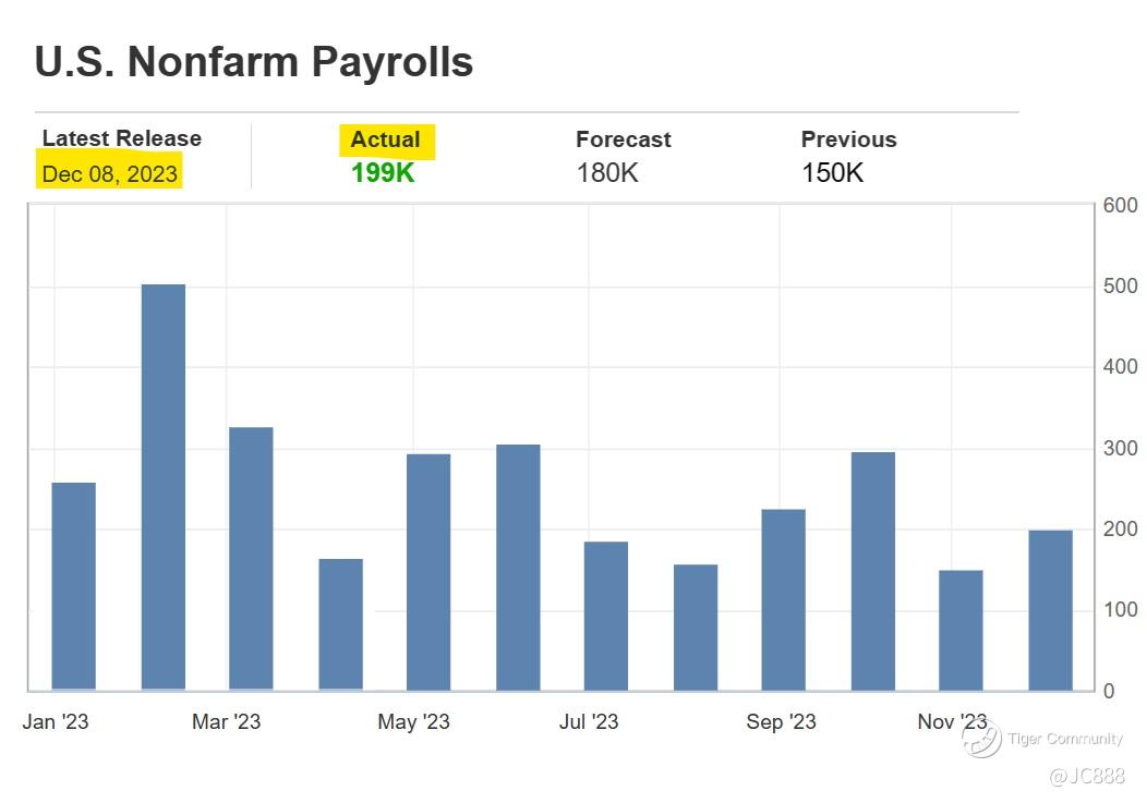 US Nonfarm payroll employment for November 2023, increased by 199,000 jobs in November, exceeding expectations by 19,000 jobs.