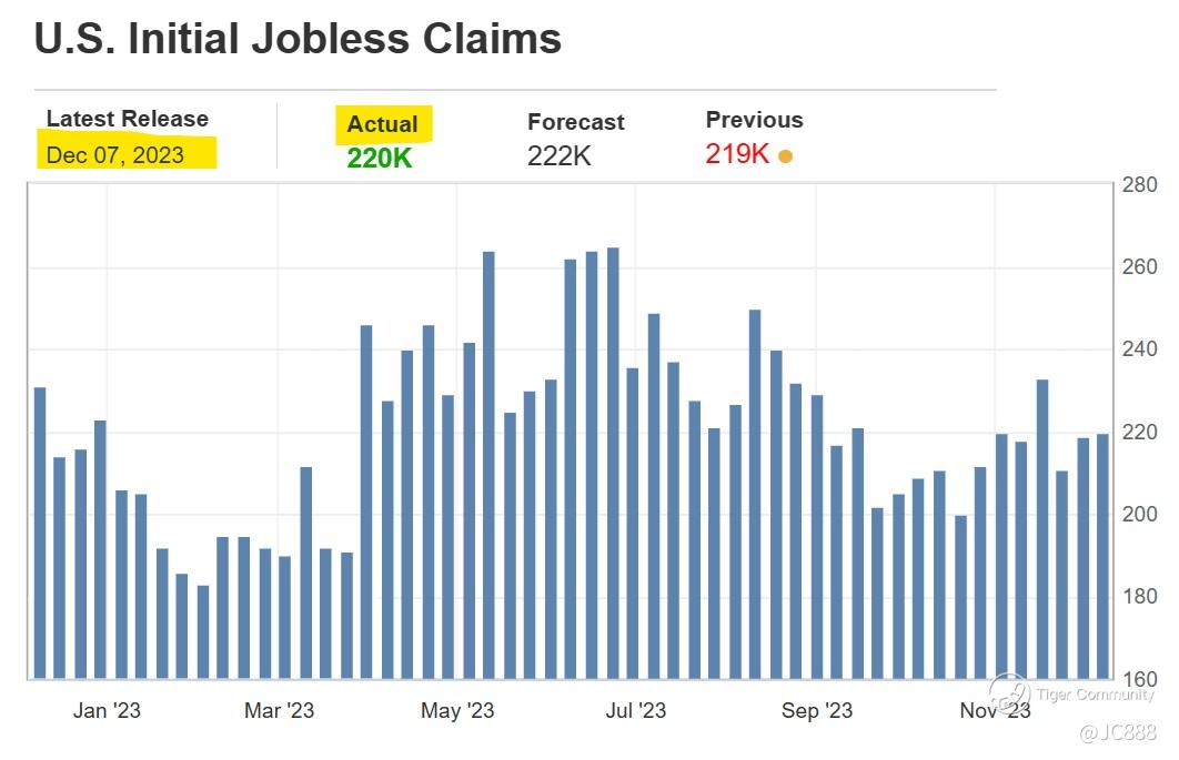US Weekly jobless claims rose by 1,000 claims (from the week before) to 220,000.