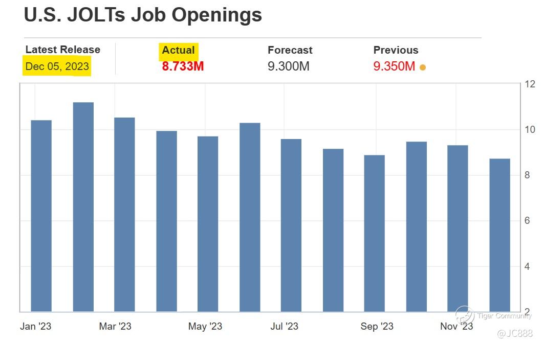 Job openings for October 2023, continued to decline, reaching the lowest level since August 2021.