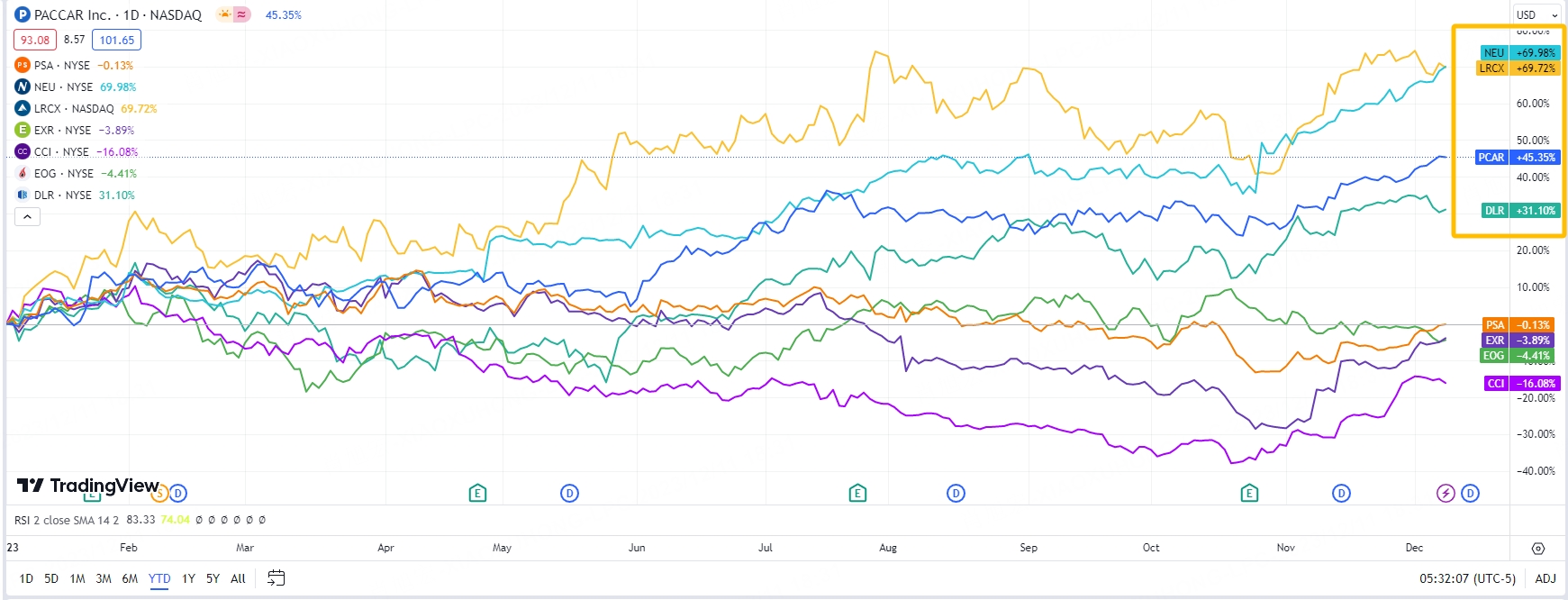 And the 2023 YTD performances of the above 8 stocks are as below: we can see 4 out of 8 stocks got positive return: $NewMarket(NEU)$, $Lam Research(LRCX)$, $PACCAR Inc(PCAR)$, $Digital Realty Trust Inc(DLR)$.