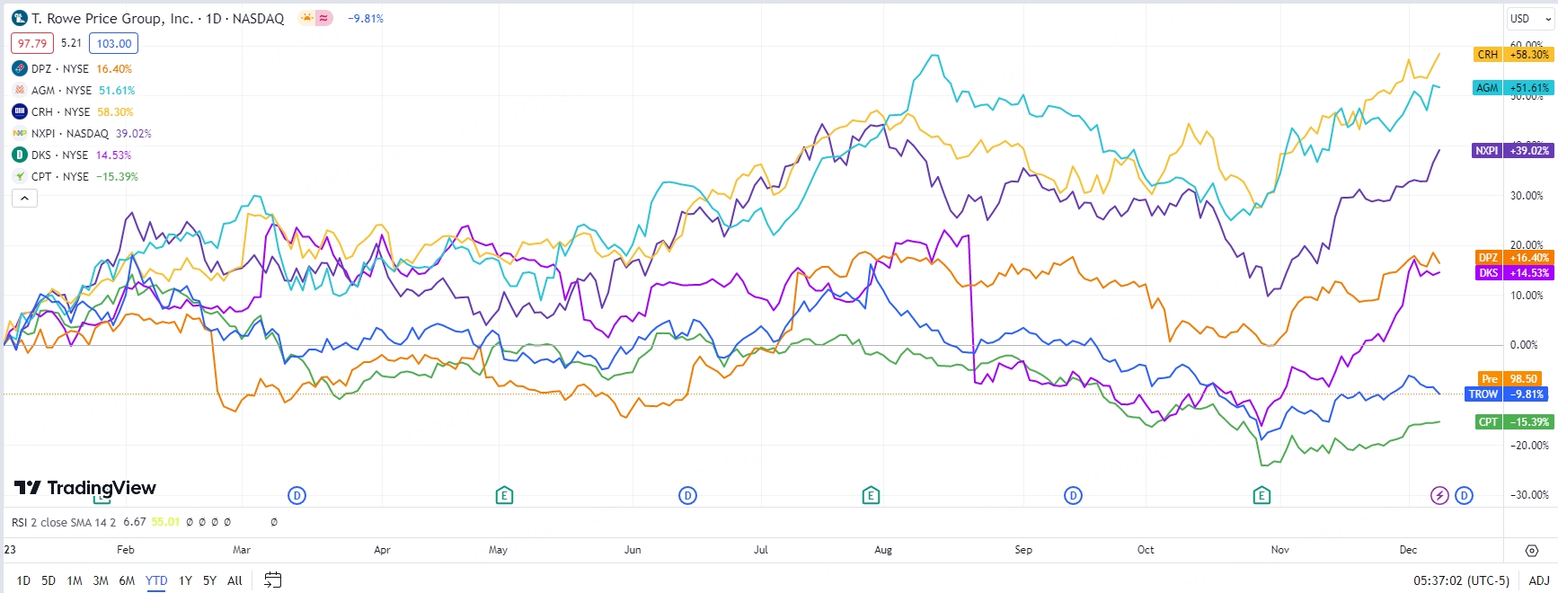 And the YTD2023 of above 7 stocks are shown as below: in side which we can see that $CRH PLC(CRH)$, $Federal Agricultural Mortgage(AGM)$, $NXP Semiconductors NV(NXPI)$, $Dick's Sporting Goods(DKS)$, $Camden Property(CPT)$ have positive YTD 2023.