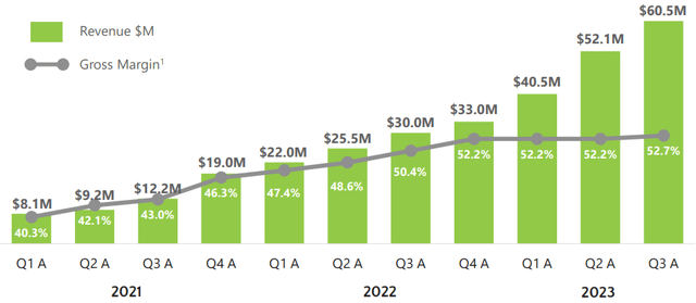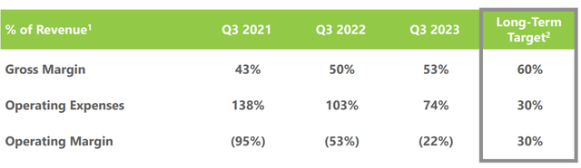 As can be seen below, gross margins improved by 10 percentage points in two years, going from 43% in 3Q21 to 53% in 3Q23. The company is making great progress towards the company's long-term target of 60%.