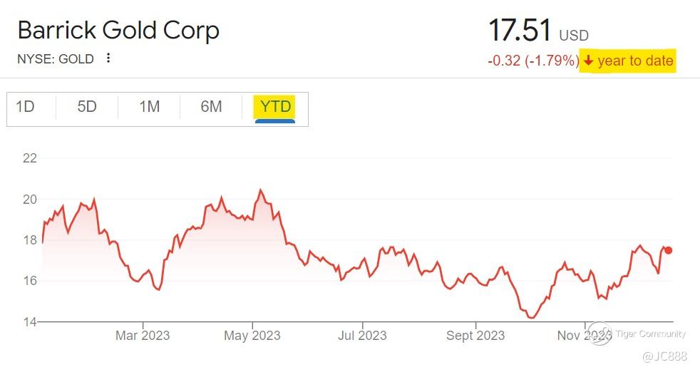 Gold miners are thought of as leveraged plays on the metal, yet Barrick shares are down marginally -1.79% this year. (see above)