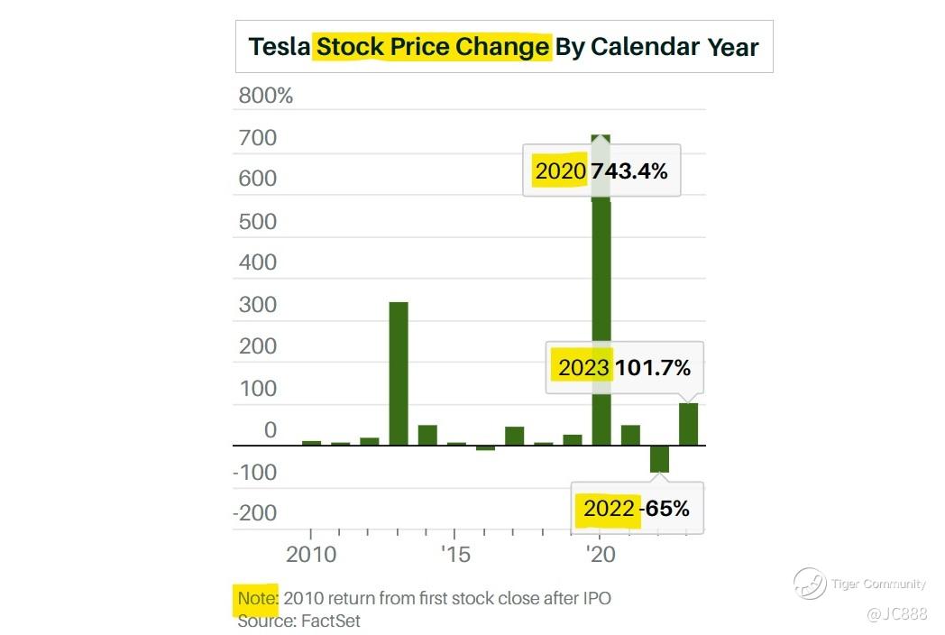 In 2023, Tesla stock rose +129.86%, after falling -65% in 2022. (see below)