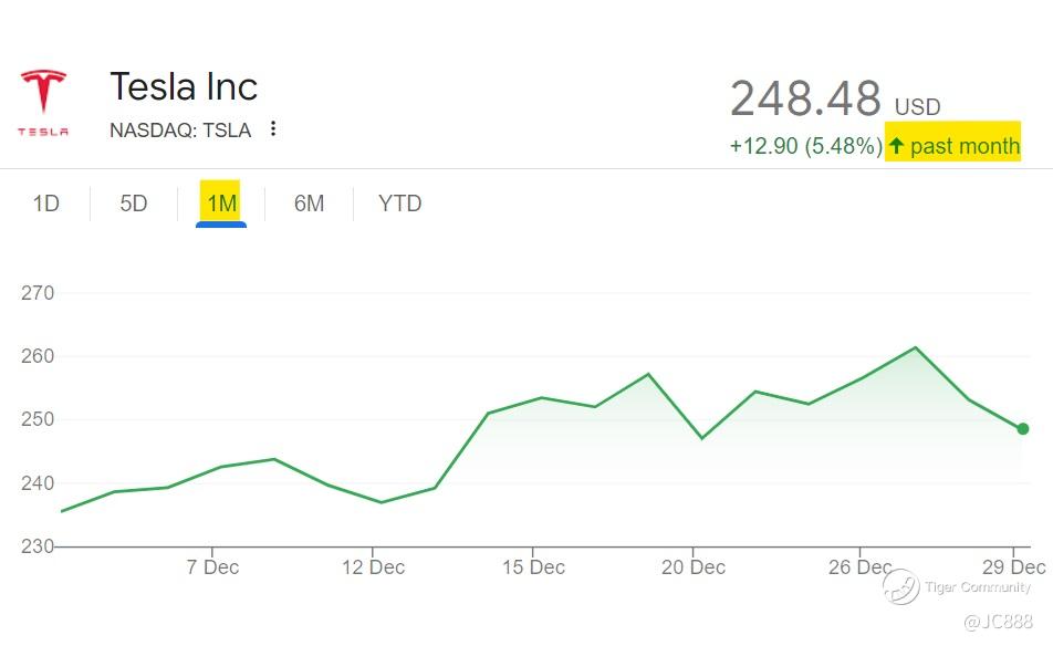 Coming into Tuesday trading, Tesla shares are up about 5.50% over the past month. (see above)