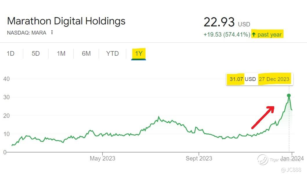 Mara peaked on 27 Dec 2023 at $31.07 per share; it has consolidated in tandem with Bitcoin prices.