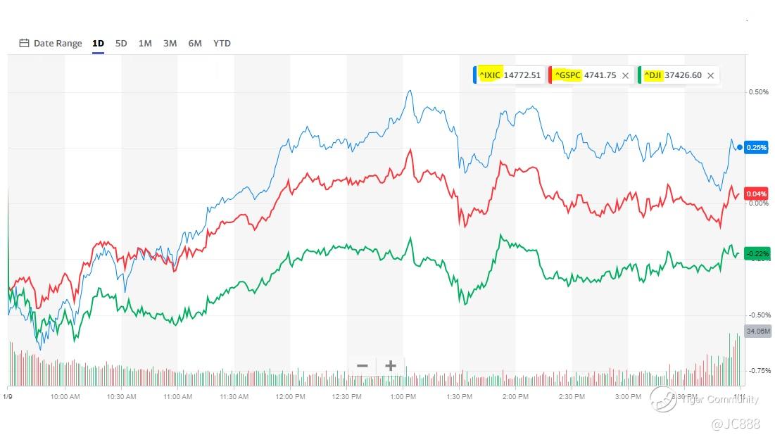 Stocks were split on Tue, 09 Jan 2024 as an early week, tech-fueled rally was cut short, after Samsung issued a profit warning, saying that it expects a -35% fall in its Q4 operating income, as demand continues to lag.