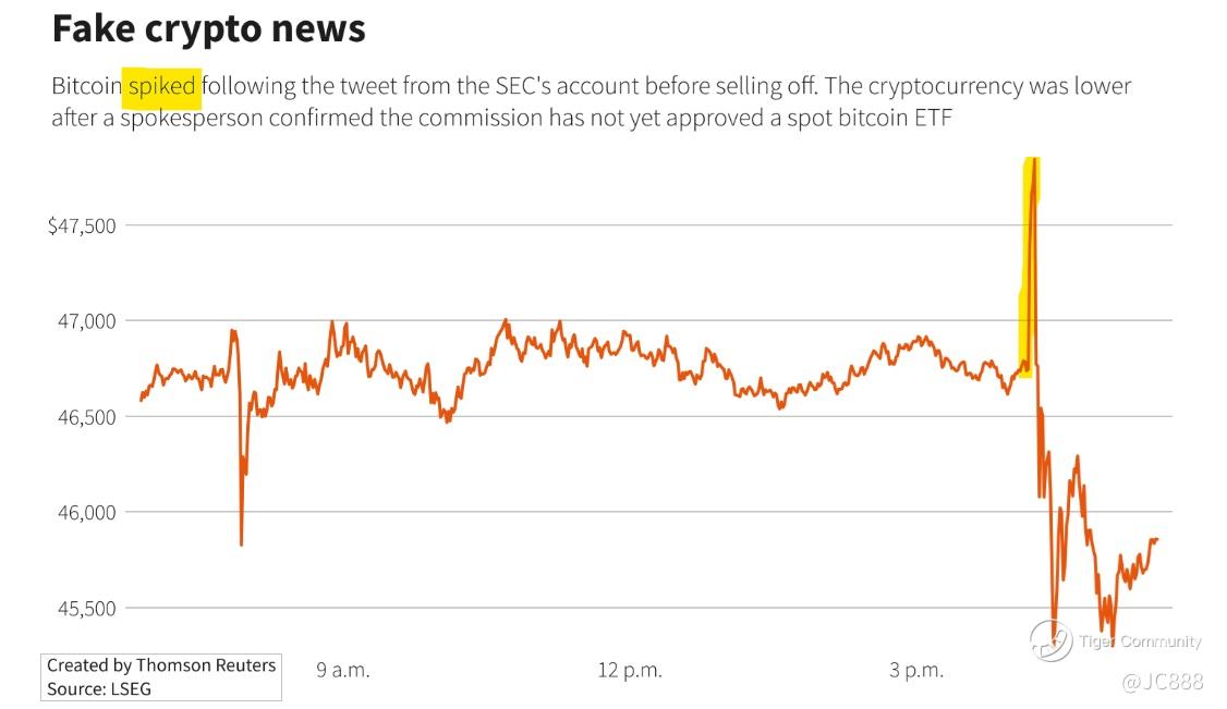 Price of Bitcoin shot up to around $48,000 on the fake post, before falling to below $45,000 minutes later.