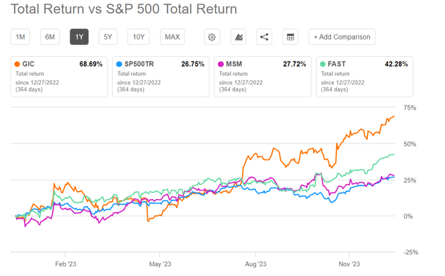 GIC has no debt. So, its balance sheet is superior to some of its peers (DSGR and FAST). Its liquidity totaled $138 million as of September 30, 2023. During Q3, it repaid the $40.3 million balance on the credit facility. The company pays an annual dividend of $0.80 per share with a dividend yield of 2.05%. The management is confident in managing its strategic plan and funding its quarterly dividend through its liquidity.