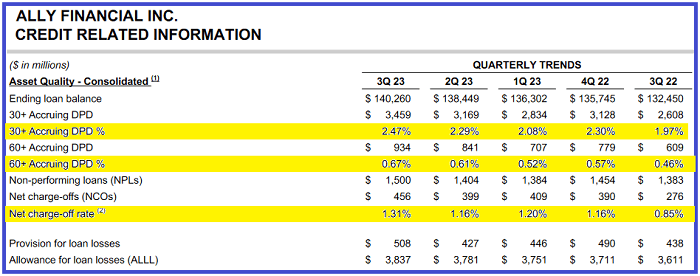 The 30+-day and 60+-day delinquency rates have been rising steadily over the last four quarters. The charge-off rate rose 54% in Q3 YoY. The declaration of a "delinquent" loan is nebulous, however. This is because lenders will grant an extension (temporary forbearance) up to a certain point. Extended loans are not classified as delinquent. Recall from the last issue that CVNA has granted extensions on over 10% of its outstanding loan balance in September, up from 1.97% in September 2022. While it is likely that ALLY has not extended 10% of its loans outstanding, I have no doubt that it has extended a material percentage (over 5%). Ally is likely massaging its GAAP numbers with the granting of extensions, the deferment of charge-offs and the minimizing of its allowance for loan losses (a non-cash GAAP expense). That's a common source of GAAP earnings management with banks and finance companies.