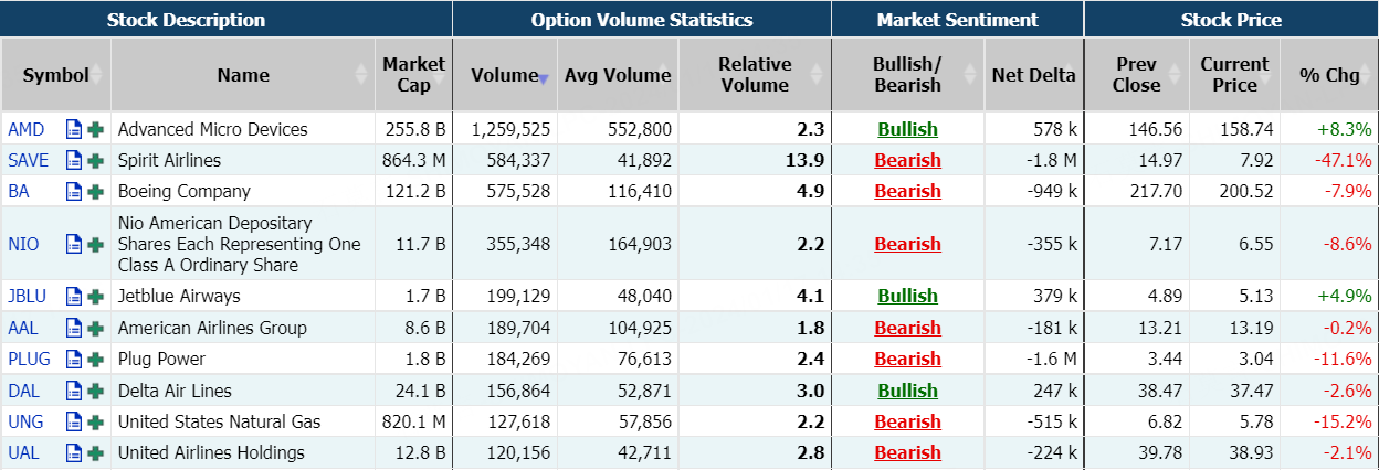 This report shows stocks with the highest volume of bullish and bearish activity by option delta volume, which converts option volume to an equivalent stock volume (bought or sold).