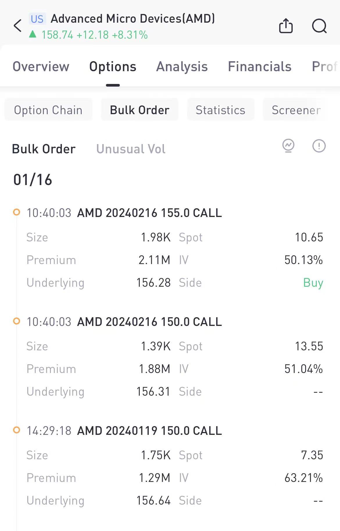 A bulk order which bought 1.98K $155 strike expiring February is worth attention. This call option bets that AMD options won't go down below $155 before February 16th.