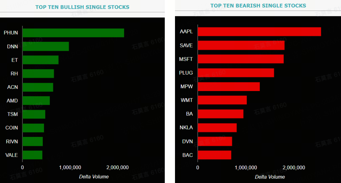 Based on option delta volume, traders sold a net equivalent of -2,562,672 shares of $Apple(AAPL)$ stock. The largest bearish delta came from selling the 19-Jan-24 185 Call, with traders getting short 2,056,918 deltas on the single option contract.