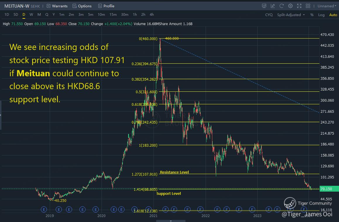 The Meituan’s ( $MEITUAN-W(03690)$ ) share price may have found its bottom near HKD 68.6 based on Technical Analysis.