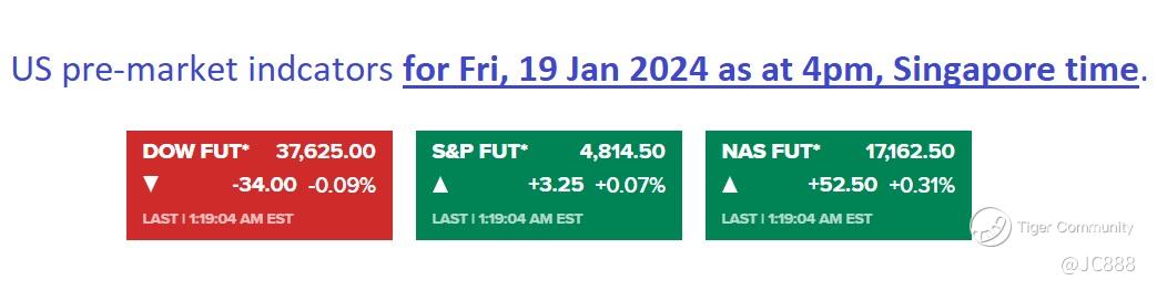 Looking ahead at pre-market indicators for Fri, 19 Jan 2024 trading (see above), for now it seems like Dow will take a marginal hit while both S&P 500 and Tech indexes will continue to improve further.