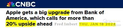 Bank of America upgraded Apple’s rating to “Buy” from “Neutral”.