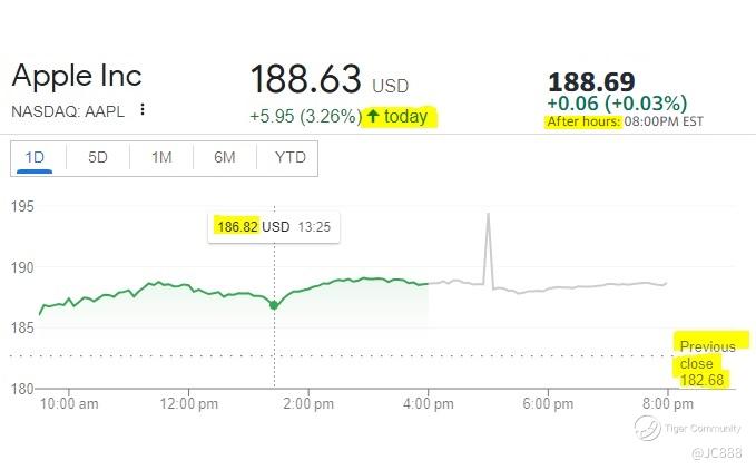 Apple continued to climb another +0.03% to $188.69 during after hour trading.