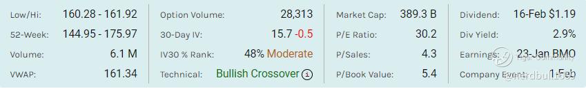 From the time it announced earnings, JNJ traded in a range between 143.80 and 163.28. The last price (161.68) is closer to the higher end of range. The implied straddle was 2.6% but we saw that JNJ decline after the announcement.